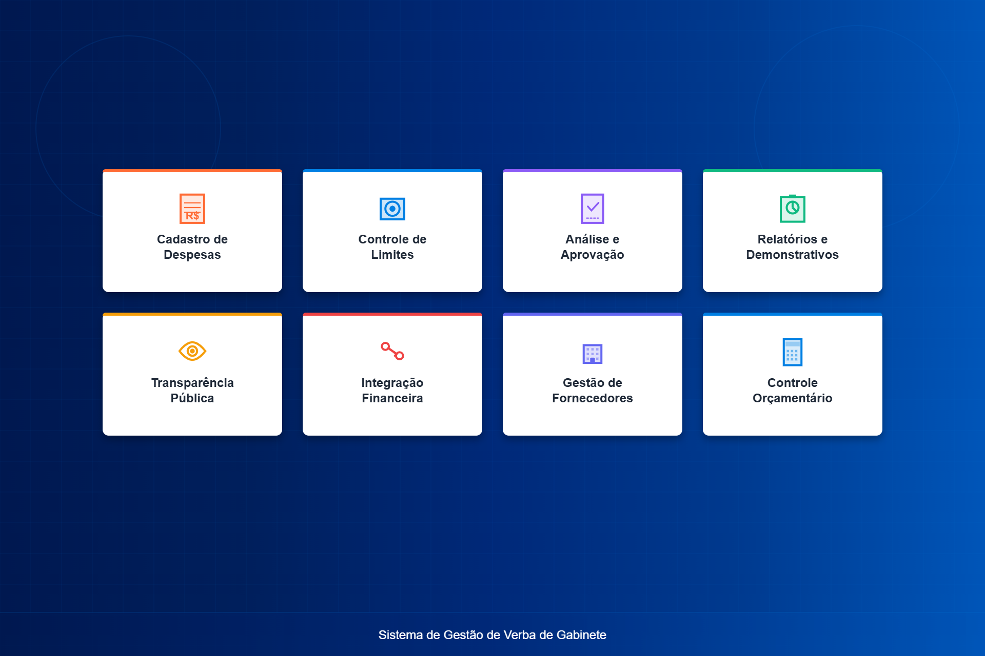 O Módulo de Verba de Gabinete é uma solução essencial para o controle, registro e acompanhamento da utilização dos recursos financeiros destinados aos gabinetes parlamentares. Ele garante que todos os gastos sejam devidamente cadastrados, analisados e apresentados de forma transparente, em conformidade com as normas vigentes.